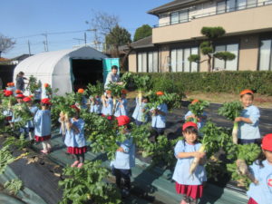 今日は、年少組が大根を収穫しました。大根を引き抜くとみんな「大きい」「重い」と大興奮でした。