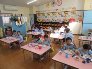お昼は大根をつかったメニューをみんなで食べました。メニューは、さつまいもご飯、大根・わかめ・油揚げの味噌汁、唐揚げ、ブロッコリー、大根のシーチキン煮、ミニゼリーでした。