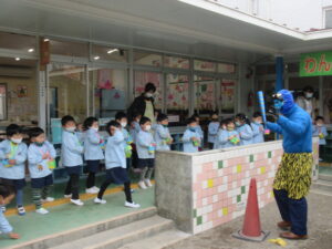 今日は豆まきを行いました。園に赤鬼・青鬼・黄鬼が来ましたが、園児たちは元気に豆をまき退治しました。みんなが健康で安全な一年になることを願っています。