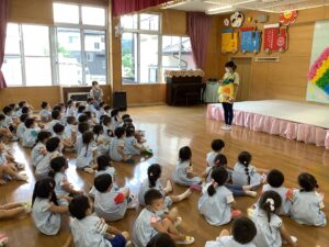 今年2回目の英語活動を行いました。フルーツや野菜のカードを使って活動を行いました。楽しく元気に活動できました。