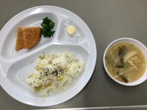 今日は昨日収穫した大根を使った食育活動を行いました。メニューは、サツマイモご飯、大根の味噌汁、ほうれん草のおひたし、ハムカツ、チーズでした。おいしかったね。