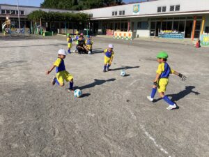 毎週火曜日2時から本園の園庭でサッカー教室を開催しています。現在年長児7名、年中児4名が活動しています。