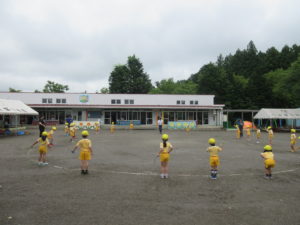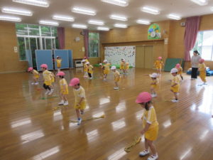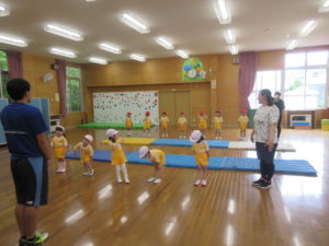 今日は体操教室でした。年中→年少→年長の順番で実施しています。年中・年少さんの時には雨でしたのでホールで行いました。年長さんは雨がやみましたので園庭で実施できました。