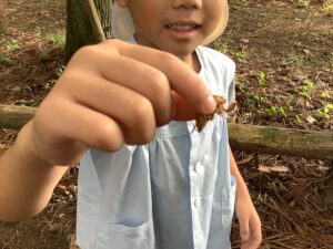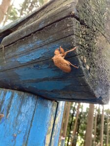 森はひんやりしていて過ごしやすく、遊ぶのにはちょうど良い環境です。一時はうるさいほど鳴いていた蝉も、かなり少なくなり、抜け殻が淋しそうにしています。