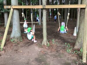 ターザンロープ、ブランコ、アスレチック、輪投げなど、自然の中に子どもたちを引きつける遊具がたくさんあります。