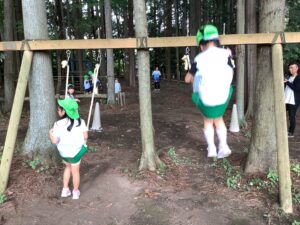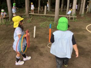 またある子は、アスレチックをやりながら、「先生、これ自然のトンネルだね。まるでプラネタリウムみたい。」頭の上の枝をトンネルに見立て、木の葉の模様を星に見立てプラネタリウムを思い出したのでしょう。大人にはできない想像力を働かせて遊びを次々と発展させていきます。