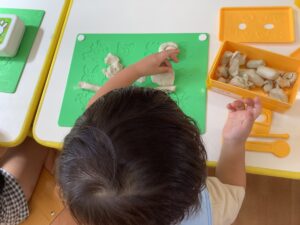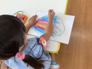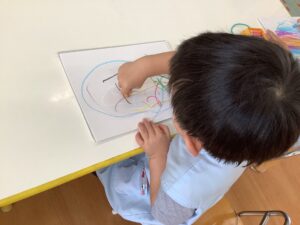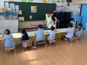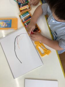 お片付けが終わると、お楽しみの粘土やお絵描きが始まりました。粘土の感触を楽しみ、また、クレヨンの使い方を知り、楽しみながら絵を描くことが大切です。安定した気持ちで一つの活動に集中できることは今後の成長につながっていきます。
