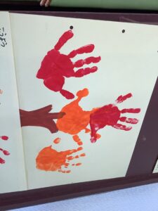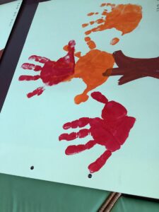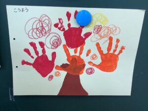 今日は「こうよう(紅葉)」を表現した制作活動を行いました。絵の具で手形をつけます。そして周りに自分の好きな絵を描いていきます。今日は葉っぱに見立てて手形をつけるところまでを行いました。今後、周りに好きな絵を描いていきます。