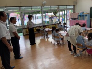 今日は第1回学校評議員会を開催しました。小学校の校長先生や自治会長様、地域の有識者、PTA代表の方、5人にお集まりいただき、園の経営について様々なご意見をいただきました。