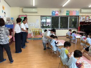 つくし組さんの戸外遊び、ちゅうりっぷ組さんのわんぱくの森遊び、年中組さんのワーク学習、年長組さんの運動会の練習を皆さんに見ていただきました。