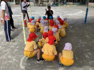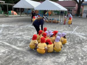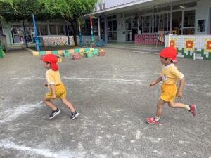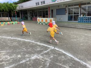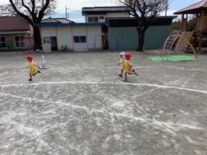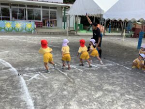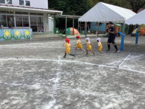 今日は体操教室です。つくし組さん、年少組さんは、かけっこの練習を行っています。