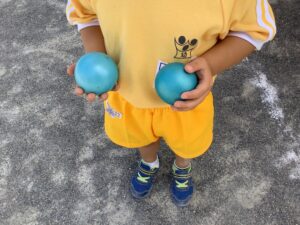 手をしっかり振れることが速く走るためには必要です。腕にしっかりと力が入るように、両手にボールを握って走る練習もこれから取り入れていきます。