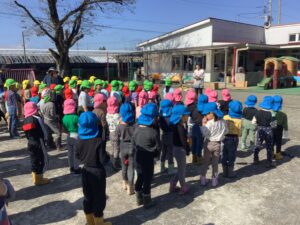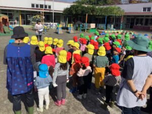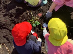 5月に年長組さんが植えたさつまいもが大きくなりました。今日は、全園児によるさつまいも掘りです。みんな長靴をはき、シャベルを持って、掘る気満々です。