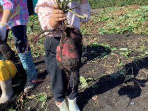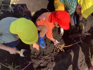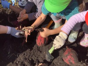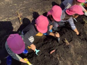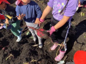 つくし組さんと年少組さんは、年長組さんに手伝ってもらいながら掘り出しました。