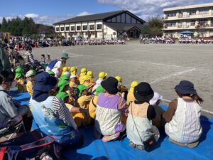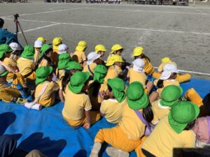 今日は絶好の天気に恵まれ、菊沢東小学校の体育発表会が行われました。仁神堂幼稚園の年長組さんが、その様子を見学に行きました。