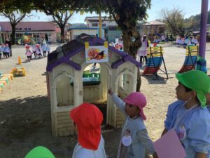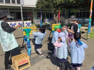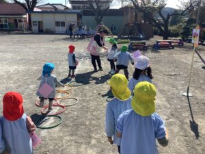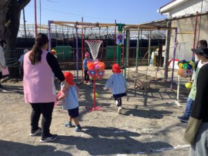 在園児からお祝いの歌をプレゼントしたあとは、広い園庭で縦割りグループに分かれてゲームを楽しみました。