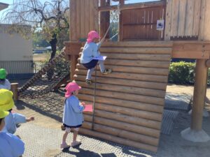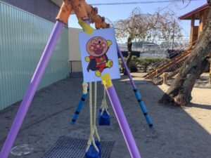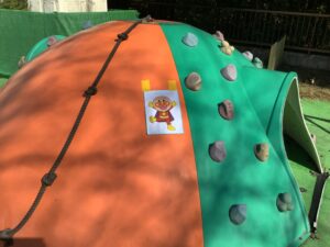 ボール投げ、玉入れ、鉄棒、ケンケンパ、ツリーハウスなどをグループで楽しみながら、園庭に隠れたアンパンマンを探します。