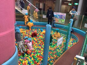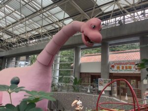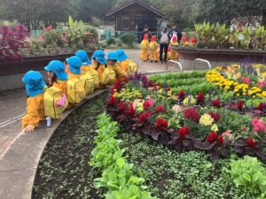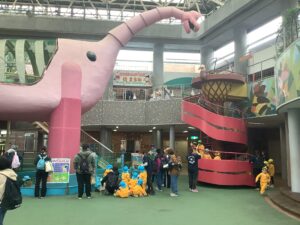 きれいな花や紅葉が子どもたちを迎えてくれました。まずは、こどもの城に行きました。室内で遊ぶお城では、ももちゃん恐竜が子どもたちと遊んでくれました。