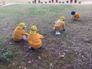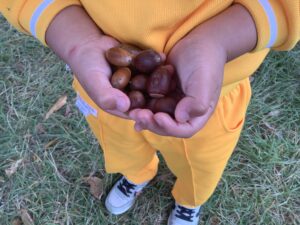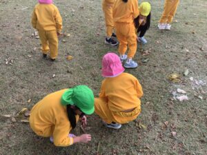 子どもたちはどんぐり拾いに夢中です。長細いもの、丸いもの、帽子をかぶったものなど、いろいろなどんぐりがありました。