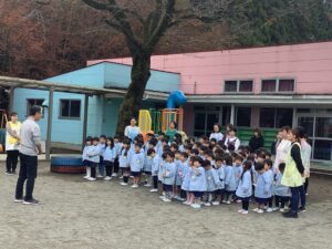 調理室からの出火を想定して訓練が始まりました。避難を促す放送があってから、全員が園庭に避難するまで1分14秒でした。園長からは、