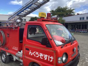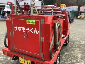 今日は、火災を想定した避難訓練を行いました。消防署の職員の方や、ミニ消防車のけすぞう君にも来ていただきました。