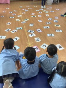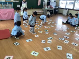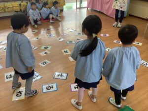 うさぎグループは、5人なので「ようちえん」の文字をみんなで探します。一人で一つのカードを見つけます。