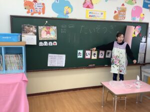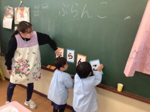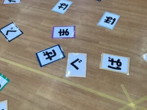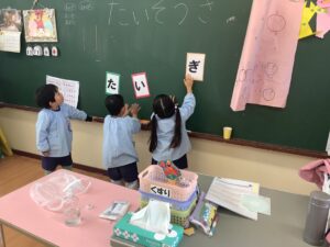 見つけたカードは、黒板に貼り、順番を考えたり、たいそうぎが5文字からできていることを確認します。