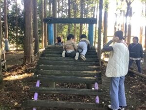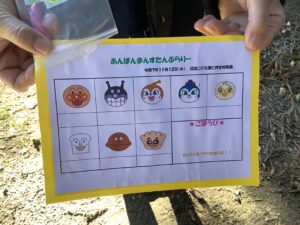 森の中に隠された8種類のアンパンマンのキャラクターを見つけます。見つけたらシールをワークシートに貼っていきます。キャラクターを見つけて指を指す子、「いたー!」と声を出す子など、様々です。中には森の誘惑に勝てず、遊具から離れない子もいます。それぞれに森の活動を楽しんでいました。