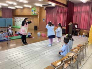 少し緊張気味の子どもたち、先生たちの励ましの言葉によって、伸び伸びと演技するこどもたちが増えてきています。