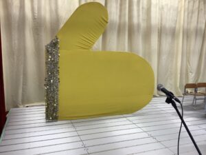 舞台には、大きな手ぶくろが置いてあります。寒さに震える動物たちが次々と手ぶくろの温もりを求めてやってきます。かえる、うさぎ、ねずみ、きつね、いのししなどがやってきます。