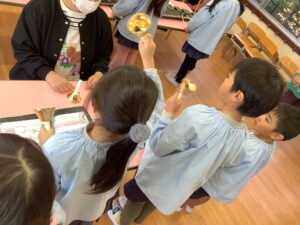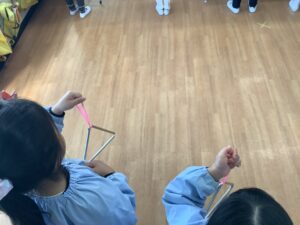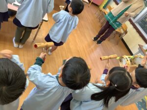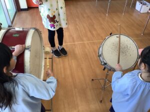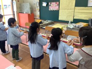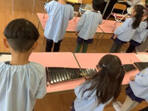 鍵盤ハーモニカ、タンバリン、すず、トライアングル、カスタネット、ウッドブロック、ハンドベル、太鼓、木琴など、様々な楽器の演奏に取り組んでいます。