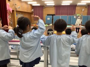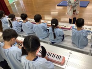 次は「こぎつね」の演奏です。みんな、これまでに練習してきた鍵盤ハーモニカで演奏します。