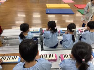 年中組さんは、演奏と合唱の練習に取り組んでいます。今日、初めてホールでの練習が行われました。子どもたちは少し緊張しているようです。