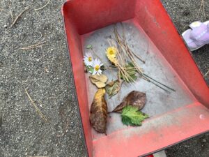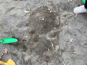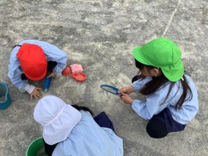 何とかして虫を探そうとする子もいます。土を掘り、真剣に探しています。この時期でも、「アリジゴク」などを見つける子がいます。何と「ウスバカゲロウの幼虫だよ!」としっかり説明してくれます。好きこそものの上手なれ。子どもたちの興味関心を最大限に引き出していくことが私たちの大切な役割です。