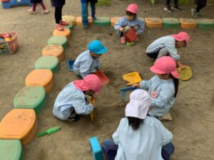 自然と異年齢集団が作られ、様々な交流活動が行われているのが、砂場です。ここに、職員が積極的に関わることにより、子どもたちの自己有用感が育っていきます。