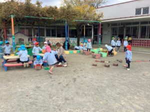 自然物に興味をもつ子もいます。冬が近づく今、植物や生物はなかなか少なくなっています。でも、子どもたちは、松の葉を集めたり、菊の花を集めたりします。「これは冬の宝物。」何て素敵な言葉でしょう。子どもたちの豊かな感性と表現を、職員も一緒に味わい、喜び、賞賛します。子どもたちにとって、素晴らしい時間となります。
