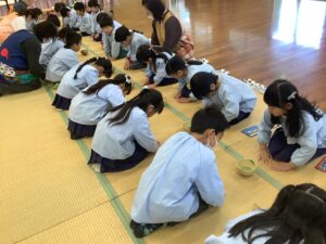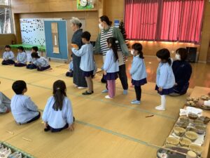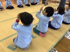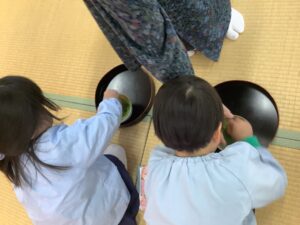今日も静かな雰囲気の中で始まりました。2月に予定されているお家の方へのお手前披露に向けて、最後の仕上げです。年長組の2組が、それぞれのお友だちに向け、お手前を披露します。