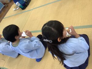 これまで全くお茶が飲めなかった子が、一生懸命に挑戦しています。担任が感激しています。苦手なことにもチャレンジしてみようという姿勢に、私たちも感動を覚えます。