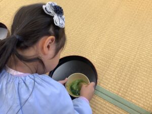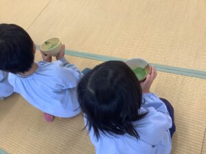 ゆり組のお友だちがたててくれたお茶を、ひまわり組の子どもたちがいただきます。