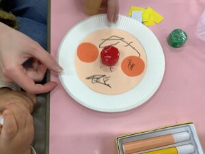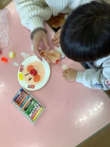 紙皿にアンパンマンの顔、ほっぺなどをはっていきます。