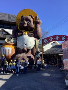 まずは、シンボルのタヌキの前で記念撮影です。みんな笑顔で良い写真が撮れました。