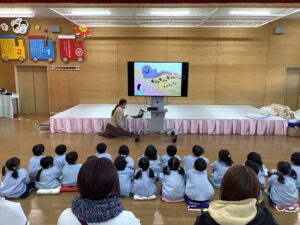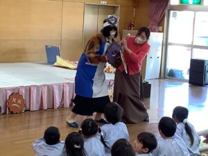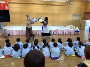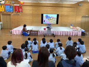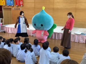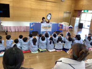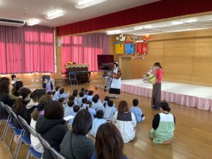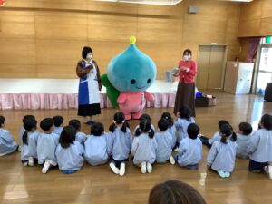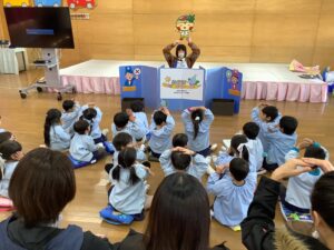講師はサニクリーンから、いーちゃんとしげちゃんに来ていただきました。対象は、年少組と年中組のお友だちと保護者の皆さんです。たくさんの保護者の方にご参加いただきました。