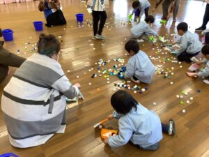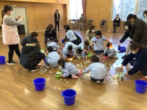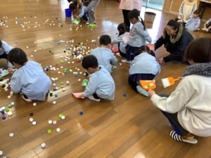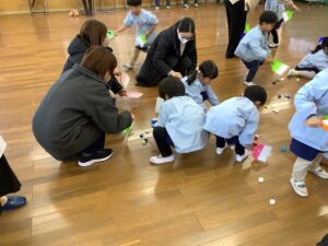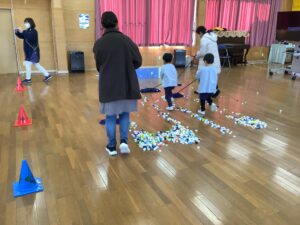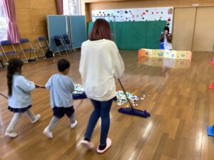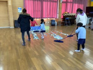 年少組さんは、ほうきちりとりゲームです。親子でお掃除の体験を行います。