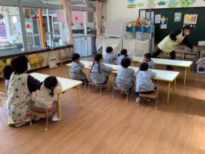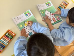 「おー。おんなじだー。」お手本と同じようにできた子は満足そうです。もちろん、まだまだうまくいかない子もいます。でも大丈夫、大丈夫。これからどんどんクレヨンを使う機会は増えていきます。少しずつじょうずになっていけばいいのです。失敗してもいいのです。