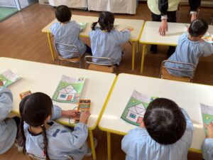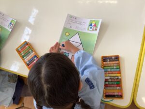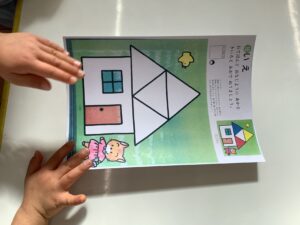 先生の説明を聞きながら、「赤だ。」「さんかくだ。」「そこじゃなくて、もっと右。」などという言葉が出てきていました。