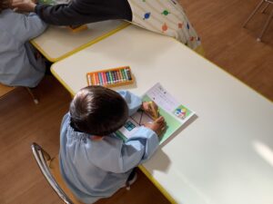 幼稚園で一番小さな子どもたちのクラス、つくし組さんでは、今日、クレヨン遊びを行いました。これまで、制作活動やお絵描きでクレヨンを使ったことはありますが、お手本を見て色を塗るクレヨン遊びは初めてです。