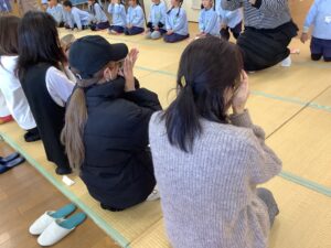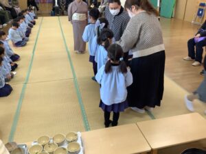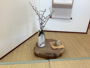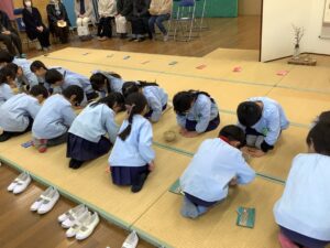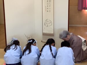 今日の掛け軸は、思いやりのある人には人が集まり、思いやりのない人からは離れていく。という意味だそうです。花は紅梅と白梅、とてもきれいです。子どもたちは、しっかりとその意味と美しさを感じています。