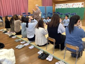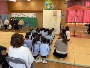 たくさんのお家の方に囲まれて、みんな少し緊張気味です。秋澤先生から、「あまり緊張しないで、いつものようにやりましょう。」と言葉をかけていただきました。