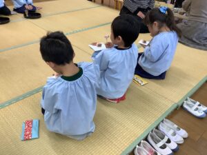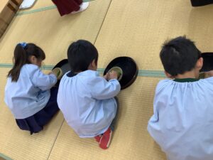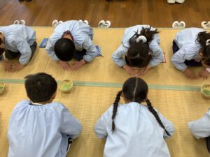 今日は、年長組さんによるお点前披露です。年長組さんは、一年間、お茶のたてかたを通して、日本に古くから伝わる礼儀などを学んできました。