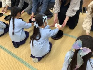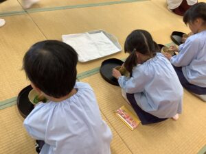 礼儀を大切にしながら、お菓子をいただいているうちに、お茶をたてます。もう、慣れた手つきでみんなお茶をたてています。